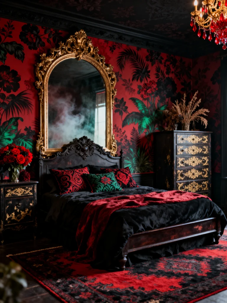 This one is a wild card! It’s Gothic, but with a tropical, botanical twist. The red wallpaper with those oversized palm leaves is so unique. It’s moody and humid, like a conservatory in the middle of a thunderstorm.