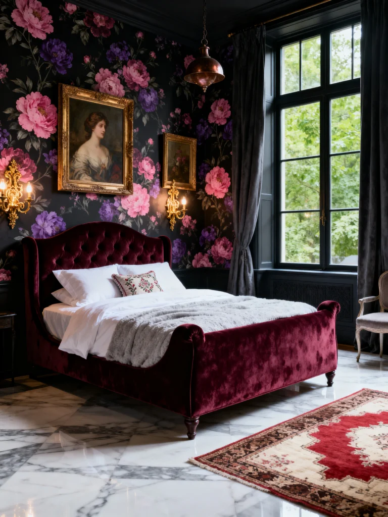 I’m obsessed with the velvet tufted bed frame in that deep wine color. It looks so plush! Also, that marble floor? Total luxury. It feels like the bedroom of a very chic, very mysterious modern-day duchess.