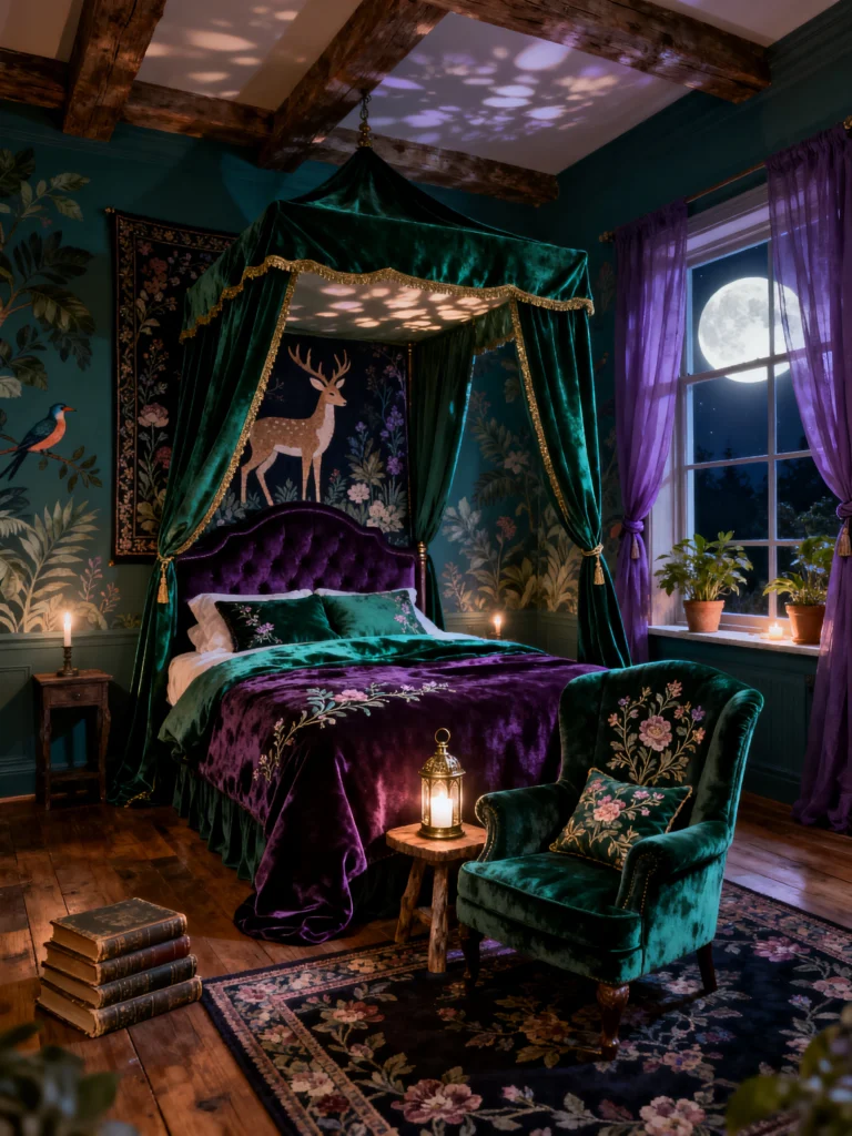 Okay, this one is pure fairytale. The emerald green canopy, the purple velvet bedding, and that incredible tapestry of a stag… I feel like I should be looking for a talking owl in here.
