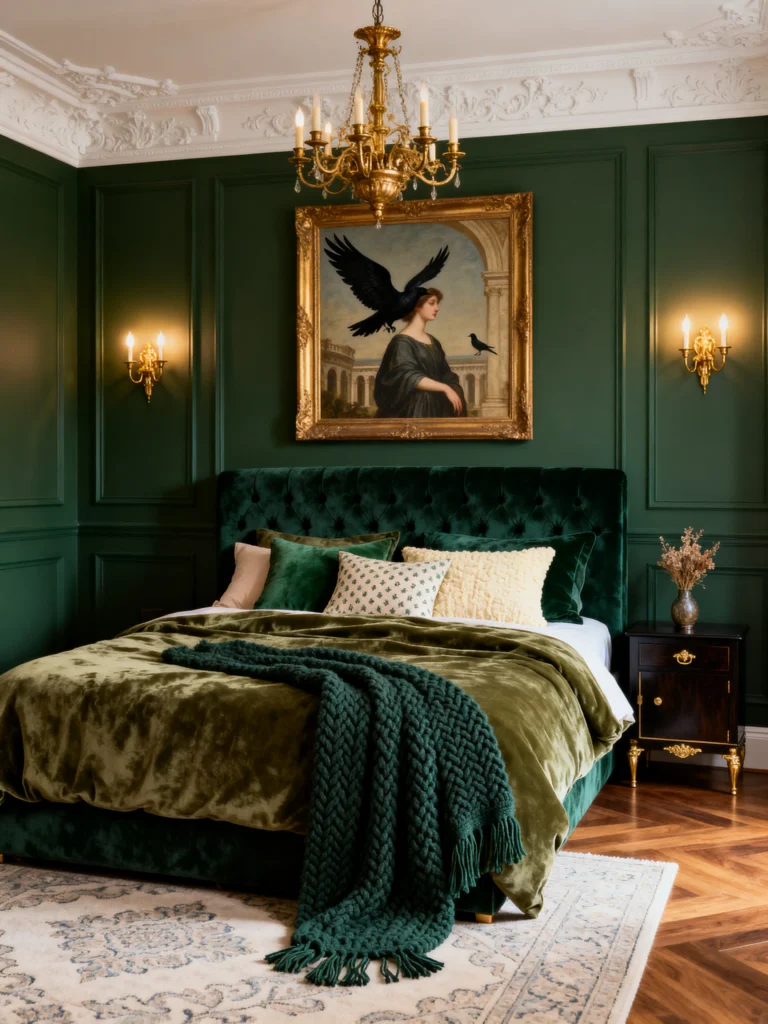 Green is such an underrated color for bedrooms. This deep forest green wainscoting is so sophisticated. And then you have that painting—a woman with a raven. It sets a very specific, slightly eerie, but beautiful tone.