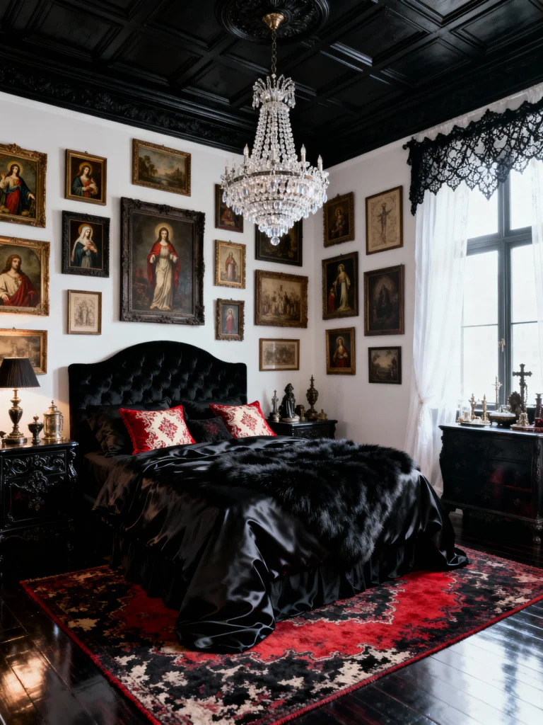 Okay, talk about a gallery wall! This room feels like a private chapel turned into a bedroom. The mix of religious iconography and that heavy, tufted black headboard is such a vibe. And can we talk about the ceiling? A black coffered ceiling is a bold choice, but with that massive crystal chandelier, it works beautifully. It’s got a “Vatican-after-dark” energy that is both intimidating and incredibly cozy.
