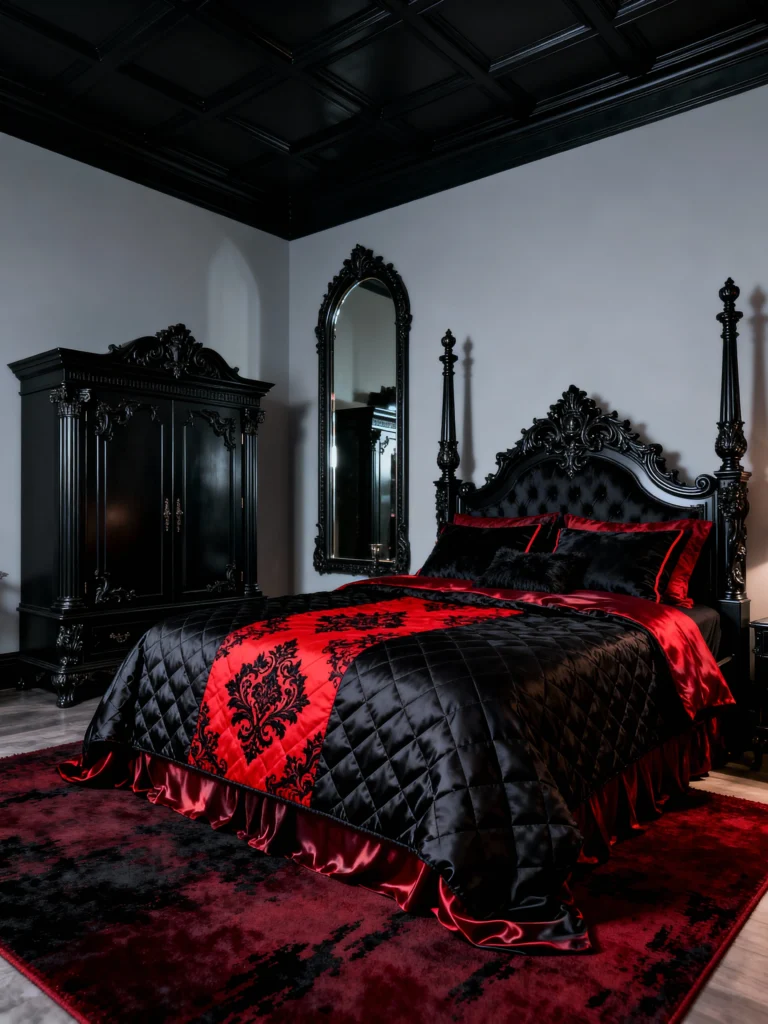 This is for the person who wants their room to look like a high-fashion runway. The red and black damask runner on the bed is such a classic Gothic staple. What I really love here is the massive, ornate armoire in the corner. It’s imposing and beautiful. This room feels very “clean” Goth—it’s organized, sleek, and the contrast between the light walls and the pitch-black furniture makes everything pop.