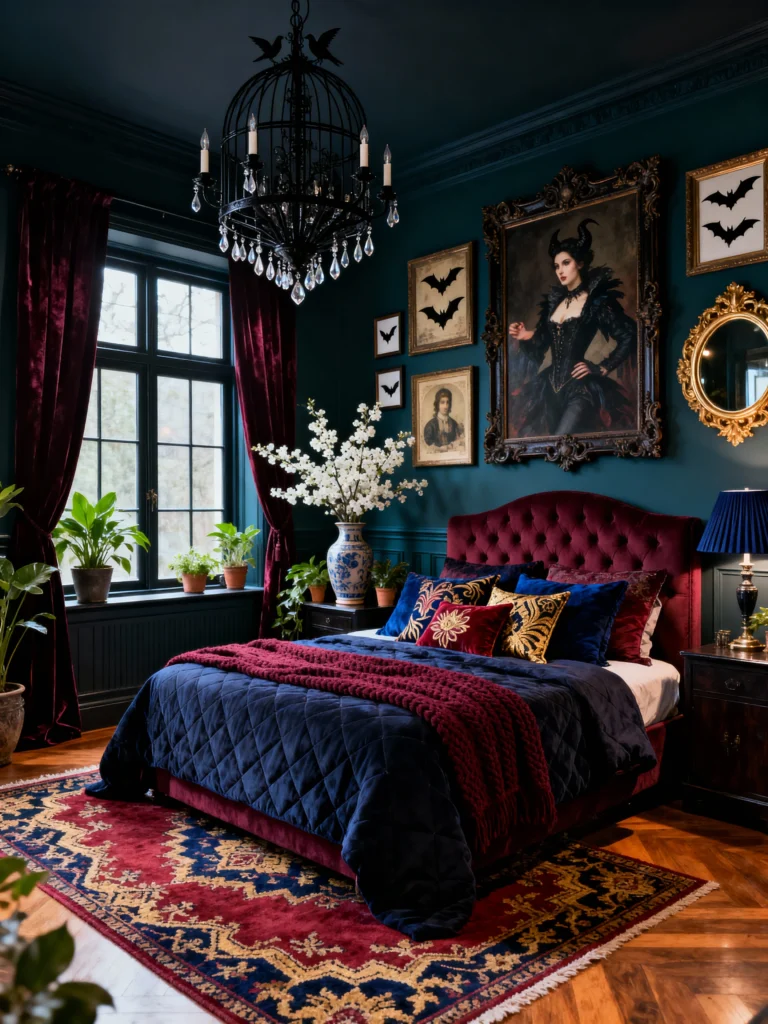This one is for the “Whimsigoth” lovers. It’s a bit more playful with the bat artwork and the birdcage chandelier (which is honestly a dream piece). The color palette here is stunning—that deep peacock blue/teal wall paired with the burgundy velvet bed frame is a color combo I didn’t know I needed. It feels lived-in and curated, like the bedroom of a very stylish witch who has a green thumb.