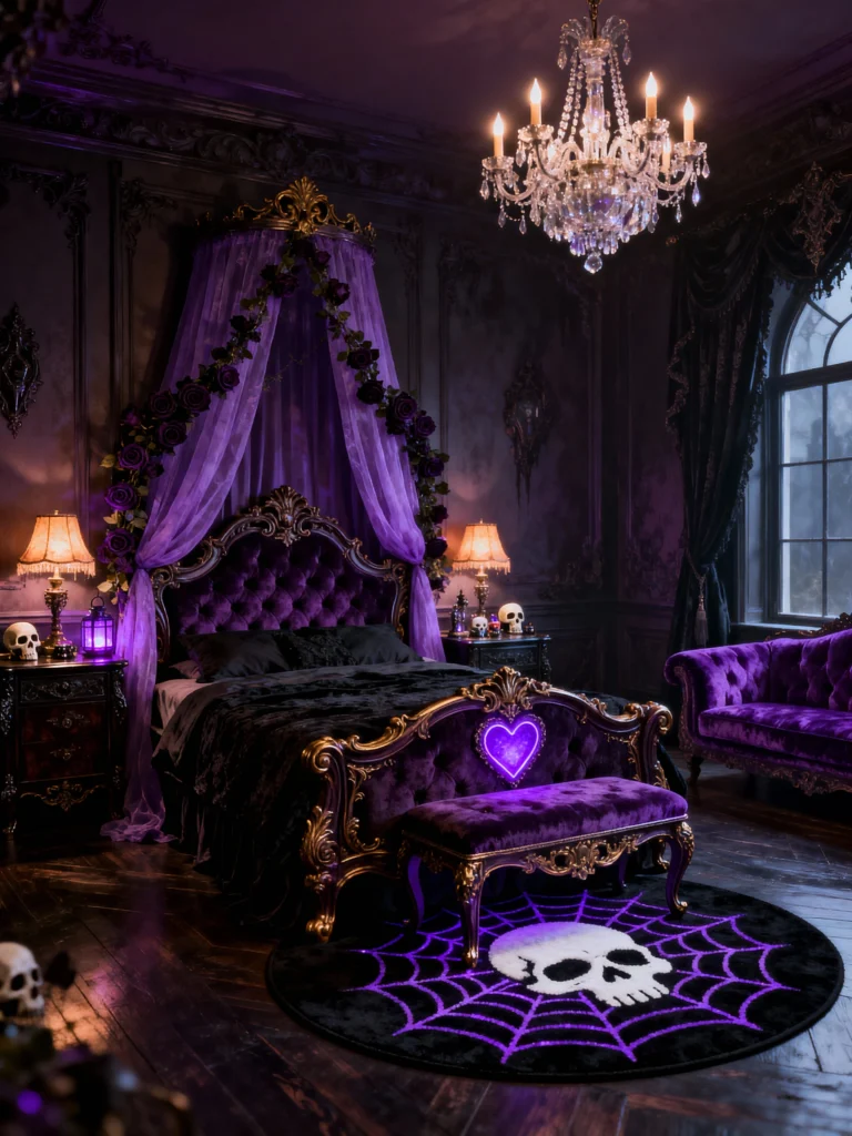 Who says Gothic can’t be bright? This room leans into the “Gothic Lolita” or “Cyber Goth” aesthetic with that glowing purple heart and the skull-and-cobweb rug. It’s definitely the most “alternative” of the bunch. The purple canopy over the bed adds a sense of fantasy, making it feel like a portal to another dimension. It’s fun, edgy, and unapologetically bold.