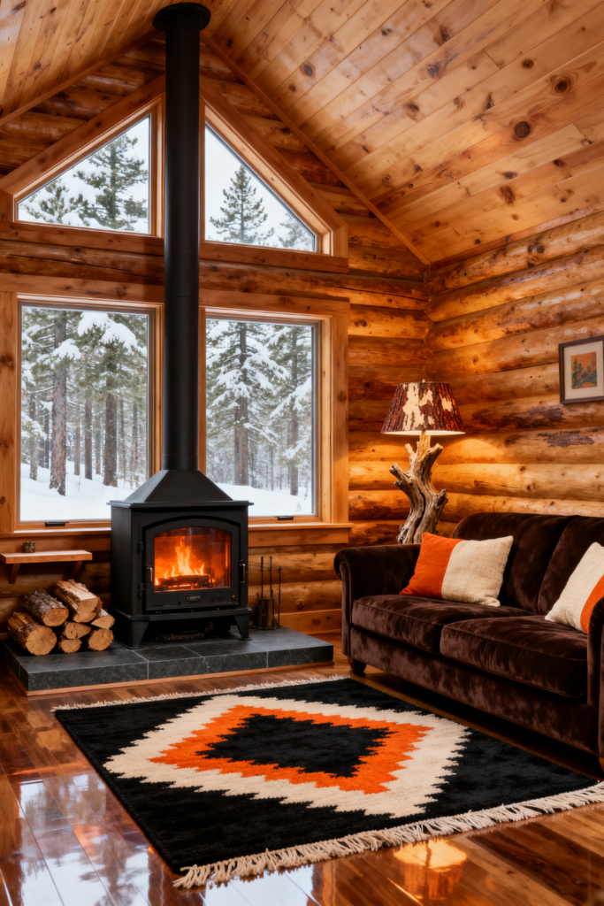 The architecture here is the star. Those high, vaulted ceilings paneled in warm wood make the space feel airy yet incredibly grounded. And can we talk about that stove? It’s not just a heater; it’s the heart of the room. Placing it right in front of the windows was a genius move. You get to watch the snowfall while feeling the direct heat of the flames. It’s the ultimate sensory experience.