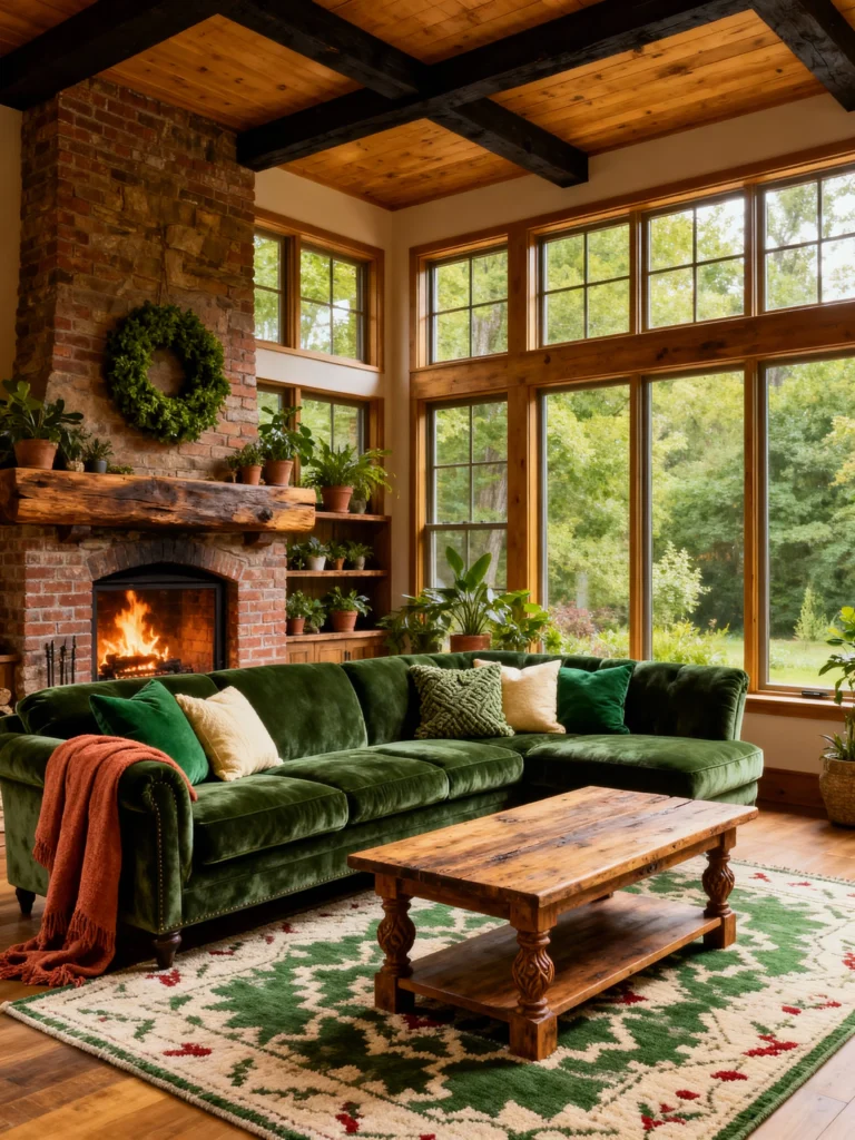 If “Forest Core” had a sophisticated older sister, this would be her living room. This space is a masterclass in using color to bring the outdoors in. That emerald green velvet sectional is absolutely breathtaking. It’s bold, it’s lush, and it perfectly mirrors the vibrant greenery visible through those massive floor-to-ceiling windows.