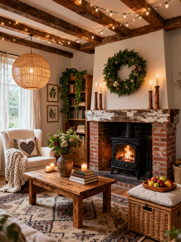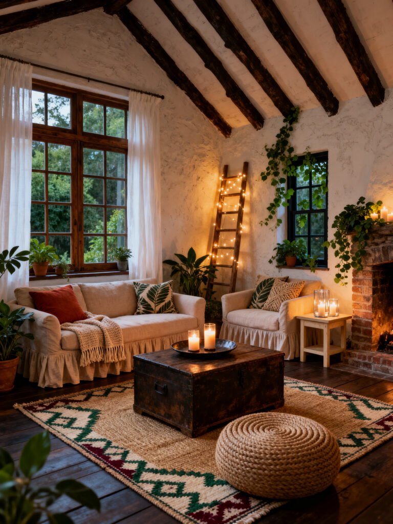 Is for the person who wants their home to feel like a permanent vacation. This has a bit of a “Boho” or “Eclectic” twist on the rustic theme. The string lights across the ceiling beams are such a fun, simple touch—they immediately make the room feel magical and casual.