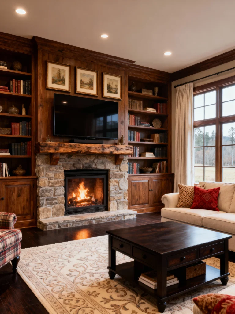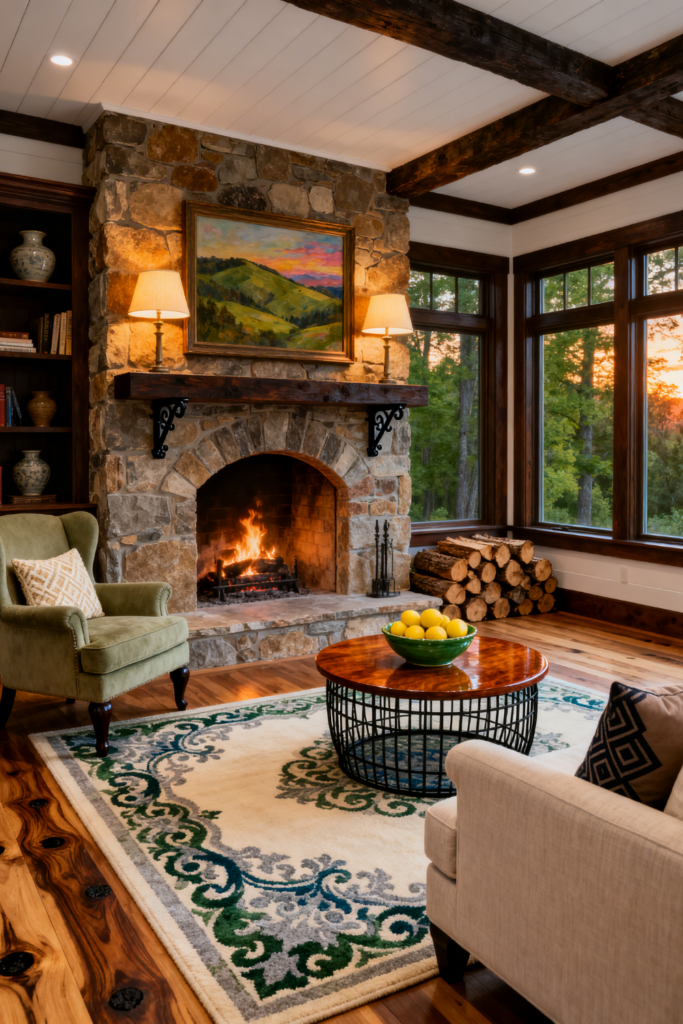 Let’s start with a room that feels like a warm hug. When you look at this first space, the first thing that hits you is that massive stone fireplace. It’s not just a feature; it’s the soul of the room. Using floor-to-ceiling stone gives the space this incredible “grounded” feeling, like it’s been there for a hundred years.