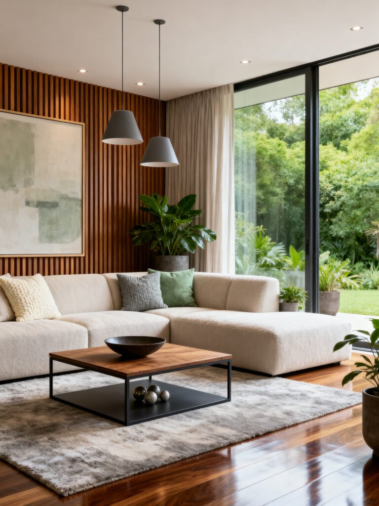 We’re shifting gears now into something much more contemporary. This room is all about clean lines, “quiet luxury,” and that stunning connection to the outdoors. The slatted wood wall is a major design trend right now, and you can see why—it adds warmth and texture without the “heaviness” of solid logs.