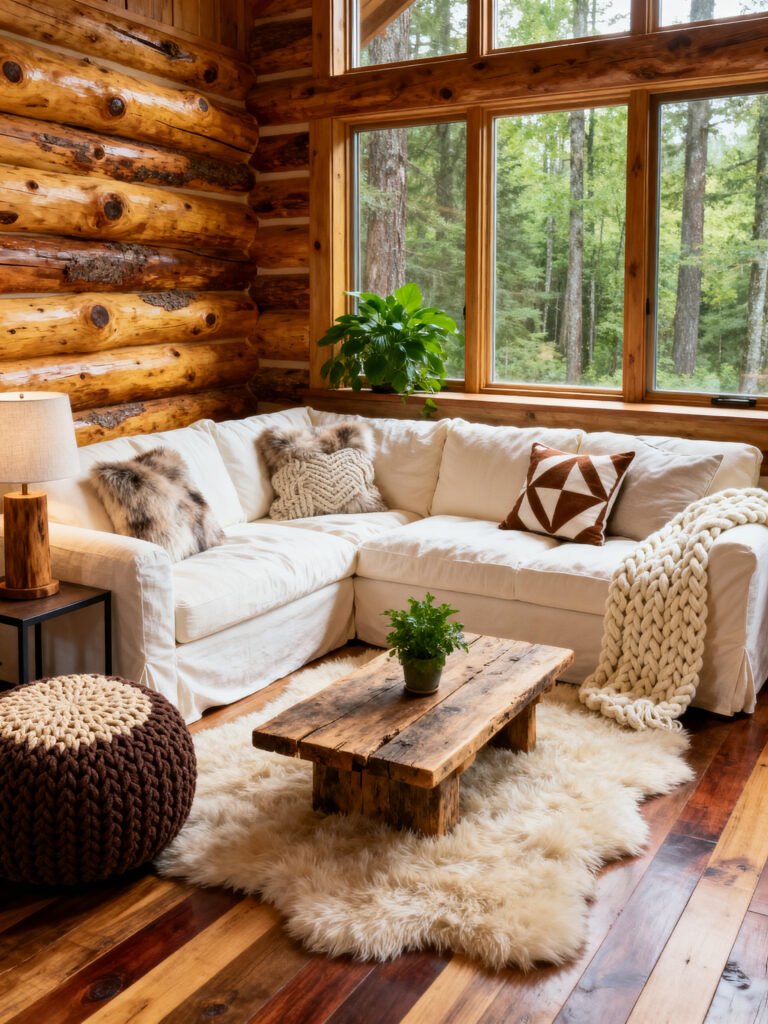 If you took a log cabin and filled it with clouds, this is what you’d get. It’s a beautiful “High-Contrast” space. You have these very dark, rugged, honey-colored log walls, and then you have this explosion of bright, white, fluffy textures.