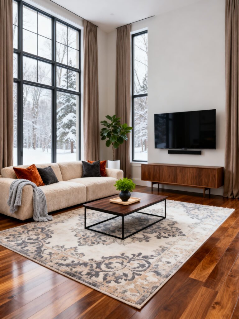 The walnut sideboard under the TV is a beautiful piece of Mid-Century Modern design. It’s sleek and functional, providing storage without taking up too much visual space. The rug is a faded, traditional pattern that adds a touch of “old world” soul to a very modern room.