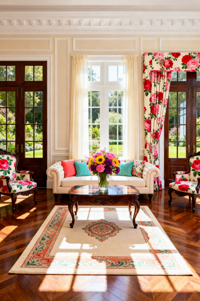 The floral patterns are the main event here. Those matching armchairs with the bold rose print are so unapologetically cheerful. And then you have the curtains that match! It’s a bold move, but in this high-ceilinged, formal room with white molding, it totally works. It keeps the space from feeling too “stiff.”