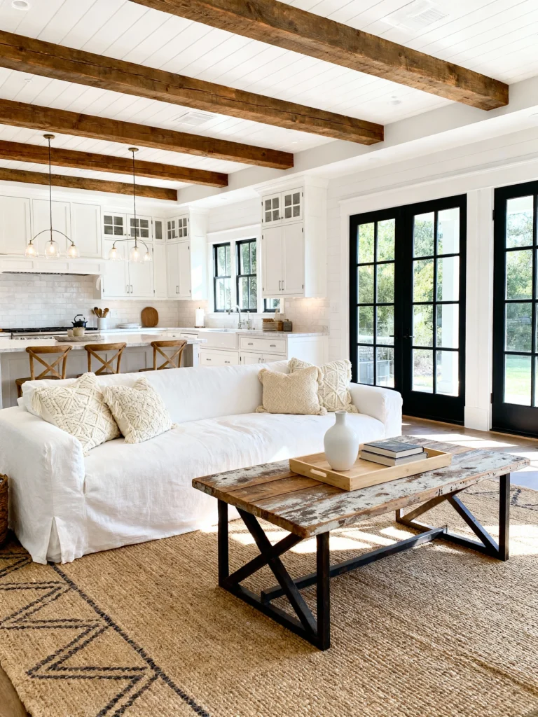 Moving from the cozy lodge to something a bit more “Modern Farmhouse.This kitchen-living combo is all about light. By painting the walls and cabinetry a bright, clean white, the space feels massive, even with those heavy dark wood beams overhead.