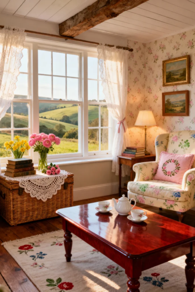 The view out the window is like a painting—rolling green hills under a soft blue sky. By placing the tea set on the low, dark wood coffee table, the room feels ready for a quiet afternoon of relaxation. I love the use of the wicker trunk as a side table; it adds a bit of “country” texture and provides a perfect spot for books and flowers.