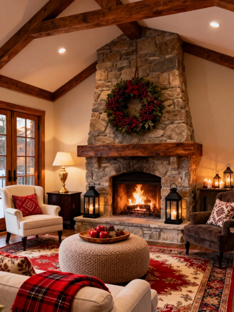 That oversized berry wreath is the perfect pop of color. In a room dominated by browns, tans, and stones, a splash of deep red is exactly what the doctor ordered. It matches the throw pillows and the patterned rug, creating a cohesive “Traditional Holiday” theme.