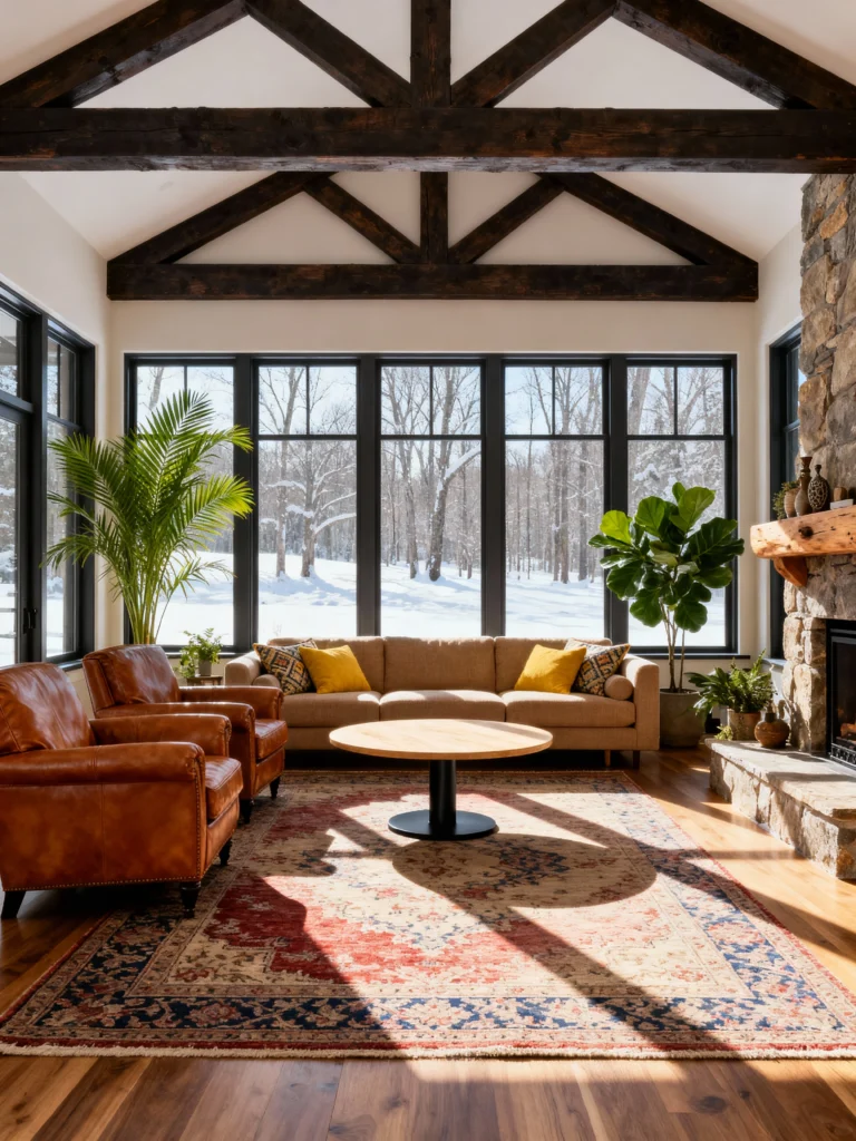 Sometimes, the best “decor” is what’s outside the window. In Image 6, the massive black-framed windows do all the heavy lifting. If you live somewhere with a view—whether it’s a snowy forest like this or just a nice garden—don’t hide it with heavy curtains.