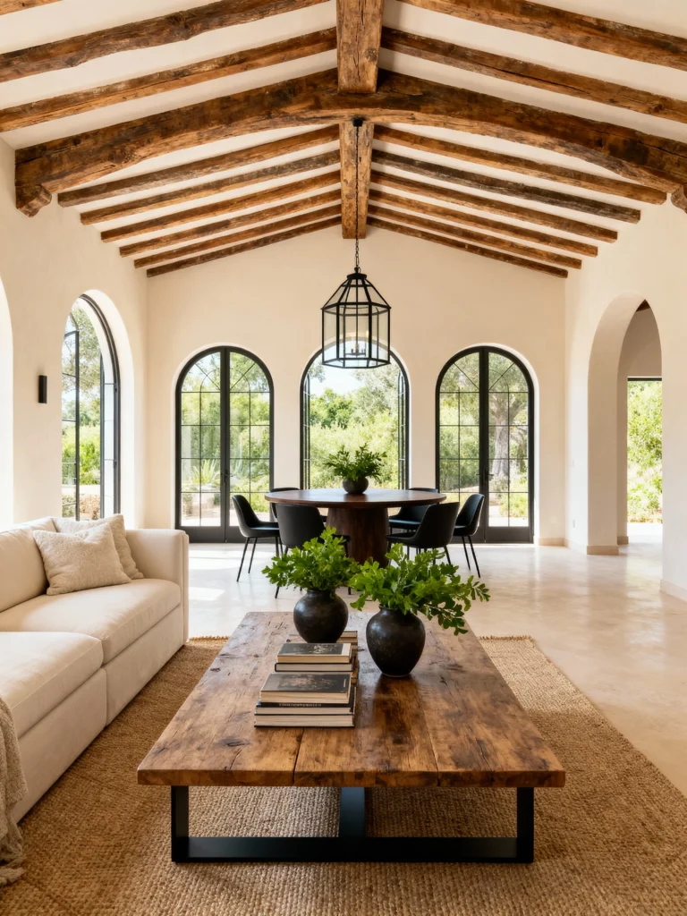 The ceiling beams here are a bit more rustic and “rough-hewn,” which provides a beautiful contrast to the smooth, plastered walls. It’s a very “Old World meets New World” look that feels incredibly high-end.