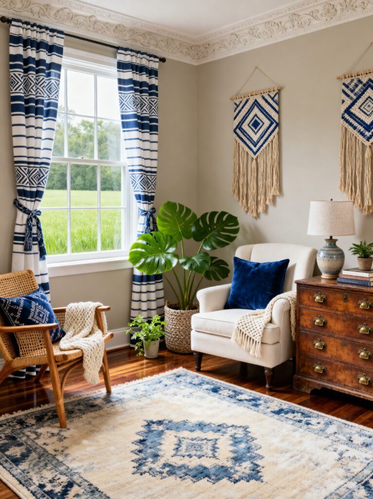 The first thing that catches my eye is the window treatment. Those curtains are bold! By using a thick horizontal stripe mixed with a geometric pattern, they frame the view of the greenery outside perfectly. It’s a great reminder that curtains don’t just have to be functional—they can be the primary art piece in a room. And look at that crown molding; it adds such a sense of history and “bones” to the space.