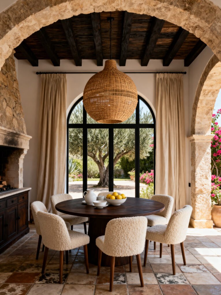 The furniture choice is really interesting. Instead of a rustic wooden dining set, they’ve gone with a sleek, dark wood circular table and “Sherpa” or “bouclé” upholstered chairs. The fuzzy, cream-colored fabric of the chairs adds a modern softness that contrasts with the hard, cool stone of the walls and floor.