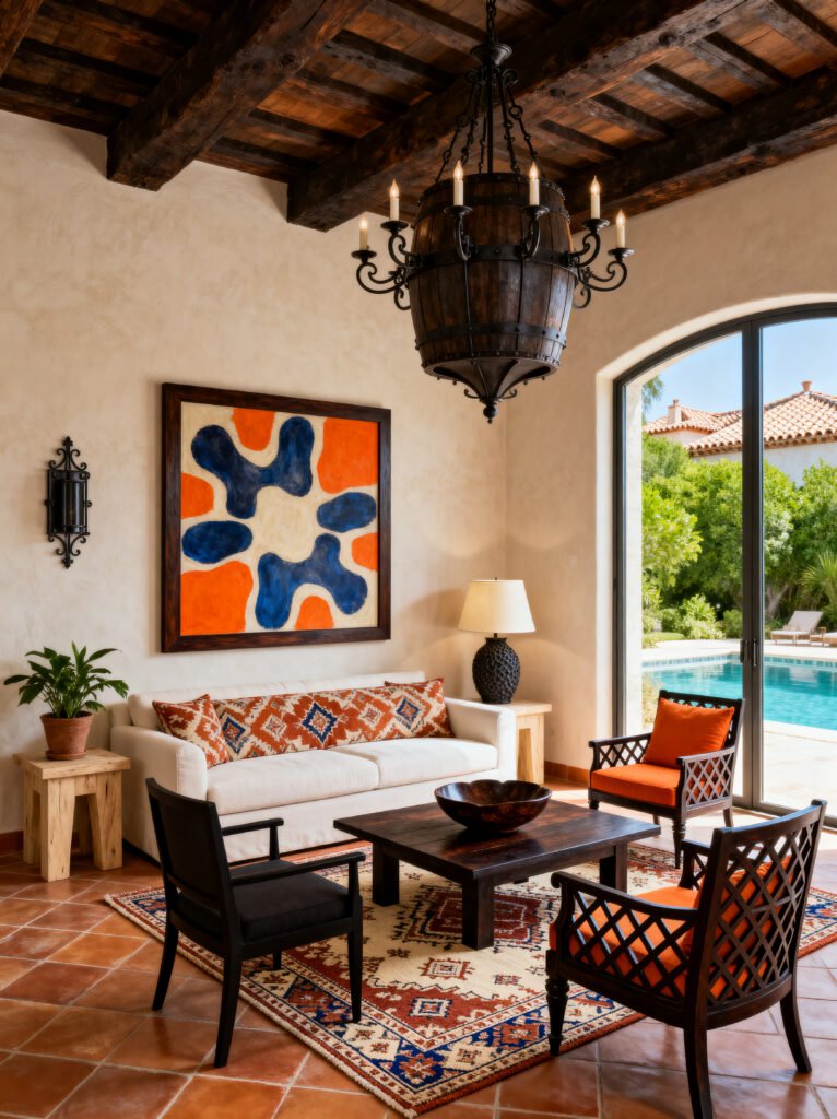 But here’s where it gets fun: instead of leaning into a strictly traditional look, there’s this incredible piece of abstract art right over the sofa. Those bright oranges and deep blues completely wake up the room! It’s such a great reminder that you don’t have to stick to one “era” when you’re decorating. You can have your rustic terracotta floors and lime-washed walls, and still throw in a graphic, colorful painting that feels totally current.