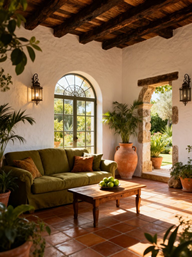 Let’s talk about that color palette. It’s earthy but vibrant. You have the terracotta tiles on the floor, which provide a warm, reddish-orange base. Then, the throw pillows bring in a rainbow of desert tones: sage green, burnt sienna, mustard yellow, and striped neutrals. It’s a great way to add “flavor” to a room without painting the walls a crazy color.