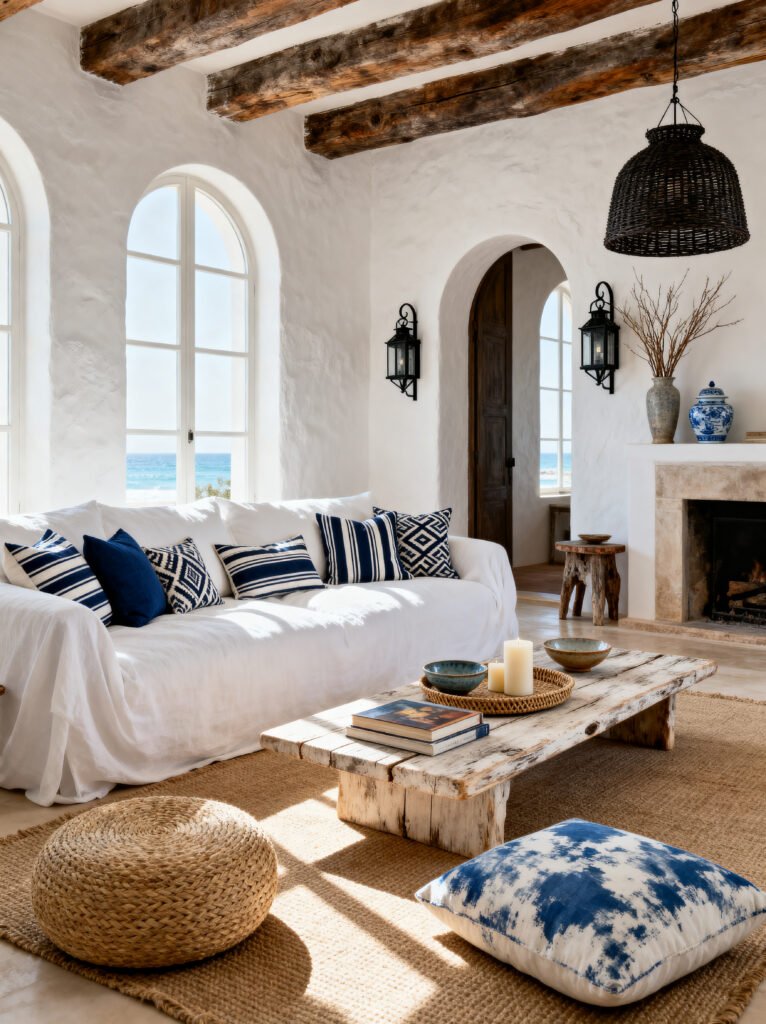 I love how the blue accents are used here. It’s not an overwhelming amount of color, but those indigo and navy pillows with the geometric patterns really pop against the white. And that tie-dye floor pillow? Such a cute, casual touch! It keeps the room from feeling too formal or “showroom-y.” The fireplace is another big win; it’s simple and clean, but the rough-hewn wood mantel adds that perfect touch of organic texture that every white room needs so it doesn’t feel cold.