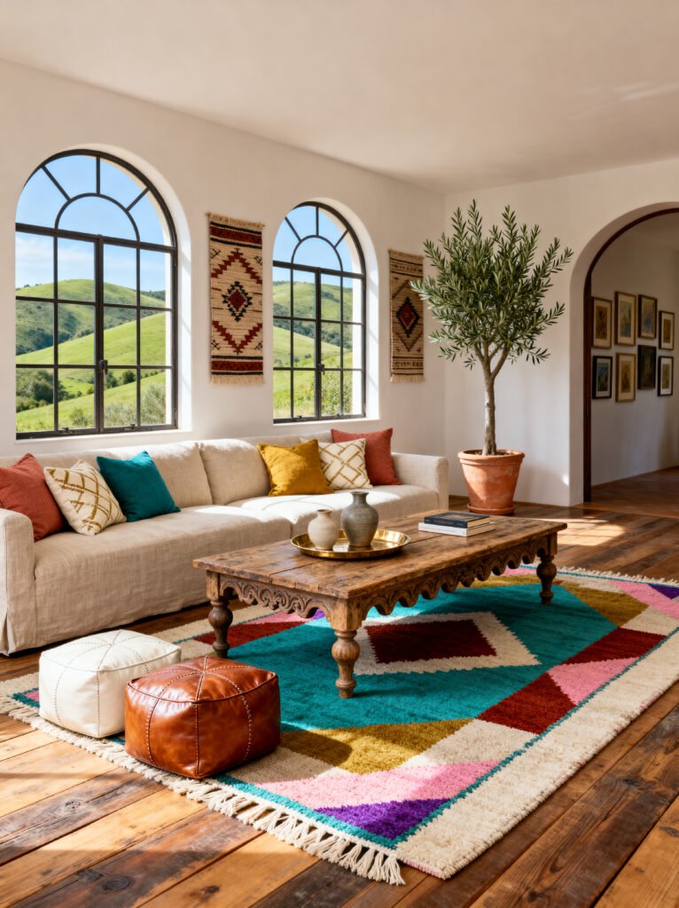 And those leather poufs! They are the perfect “nomadic” accessory. They’re great for extra seating but also add that rich, warm leather texture that ages so beautifully. The whole vibe is very “boho-luxe”—it’s artistic and colorful, but still feels very polished and high-end. It’s a space that encourages creativity and conversation, which is exactly what a living room should do.