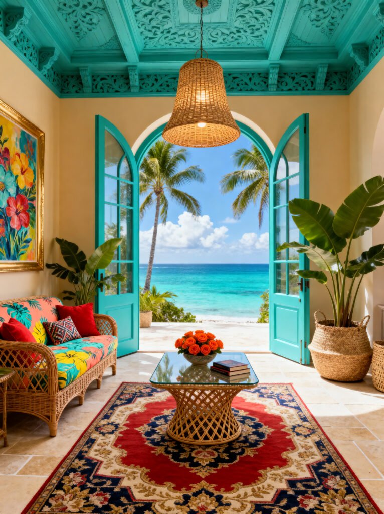 Hold on, let me just pack my bags and move into this photo. This room is an absolute tropical fantasy. The first thing that hits you is that ceiling—the intricate carving and that incredible turquoise color? Wow. It’s so rare to see a ceiling get that much love, but it completely transforms the space. It draws your eye up and makes the whole room feel like a palace.