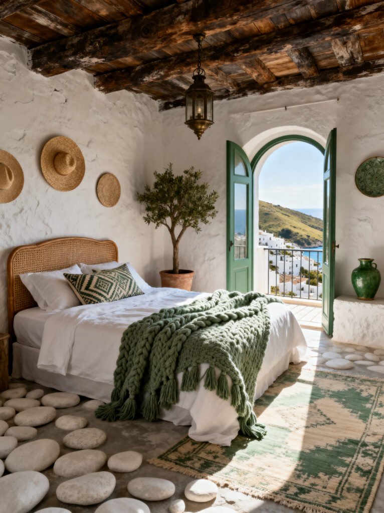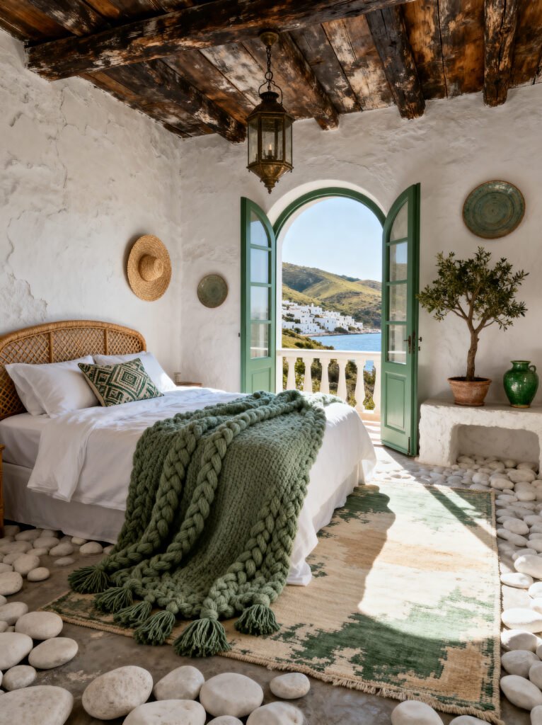 Having a small olive tree inside the bedroom is such a trend right now, and you can see why. It adds a bit of height and a soft, silvery-green color that’s very calming. And of course, those green doors opening up to the balcony with that incredible view of the white hillside houses… it’s just dreamy. This is a room built for long naps and slow mornings.