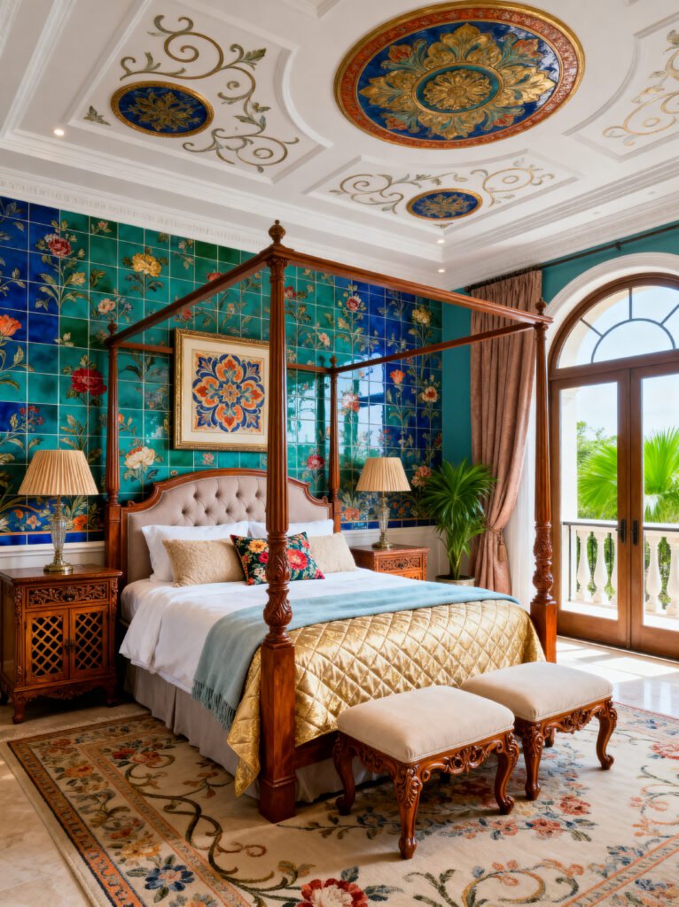 Okay, let’s go full-on glam for a second. This bedroom is pure opulence. It’s a completely different vibe from the rustic spaces we’ve seen, and it’s spectacular in its own way. That four-poster bed is a total showstopper, but it’s the wall behind it that really steals the show. Those emerald green tiles with the hand-painted floral details are absolutely exquisite. It’s like sleeping in a jewelry box!