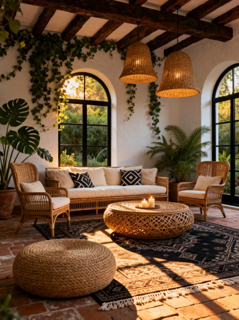 We’re ending our tour in this gorgeous, glowy sunroom. This space is a masterclass in using natural materials to create warmth. Almost everything here is woven—the sofa, the armchairs, the coffee table, the pendant lights, and even the floor pouf. By sticking to a similar material (wicker and rattan) but using different shapes and weaves, the room feels cohesive but not boring.