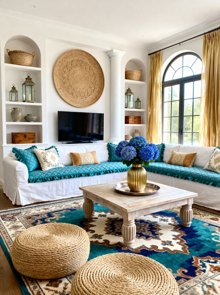 The rug here is much more vibrant than in the first two images. It has a deep teal border that ties back to the sofa cushions, creating a “color sandwich” that makes the room feel cohesive. The two rope poufs in the foreground are a fun, casual touch. They’re great for extra seating but also add that “raw” material look that balances out the polished gold vase on the table.