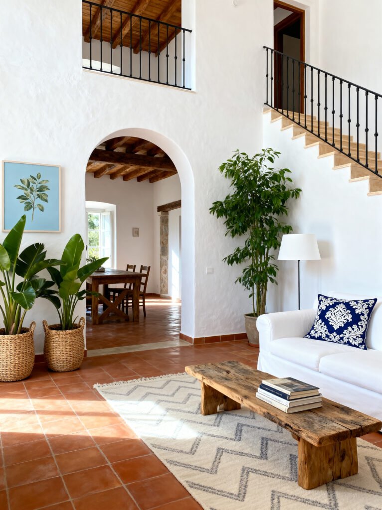 The “star” here is the architecture. That wide, smooth archway leads your eye into the dining area, creating a sense of mystery and depth. The terracotta floor tiles are classic and warm, and they look beautiful when hit by that direct sunlight streaming in. The wrought-iron railing on the stairs and the upper balcony adds a bit of a “graphic” element—the thin black lines stand out sharply against the white plaster.