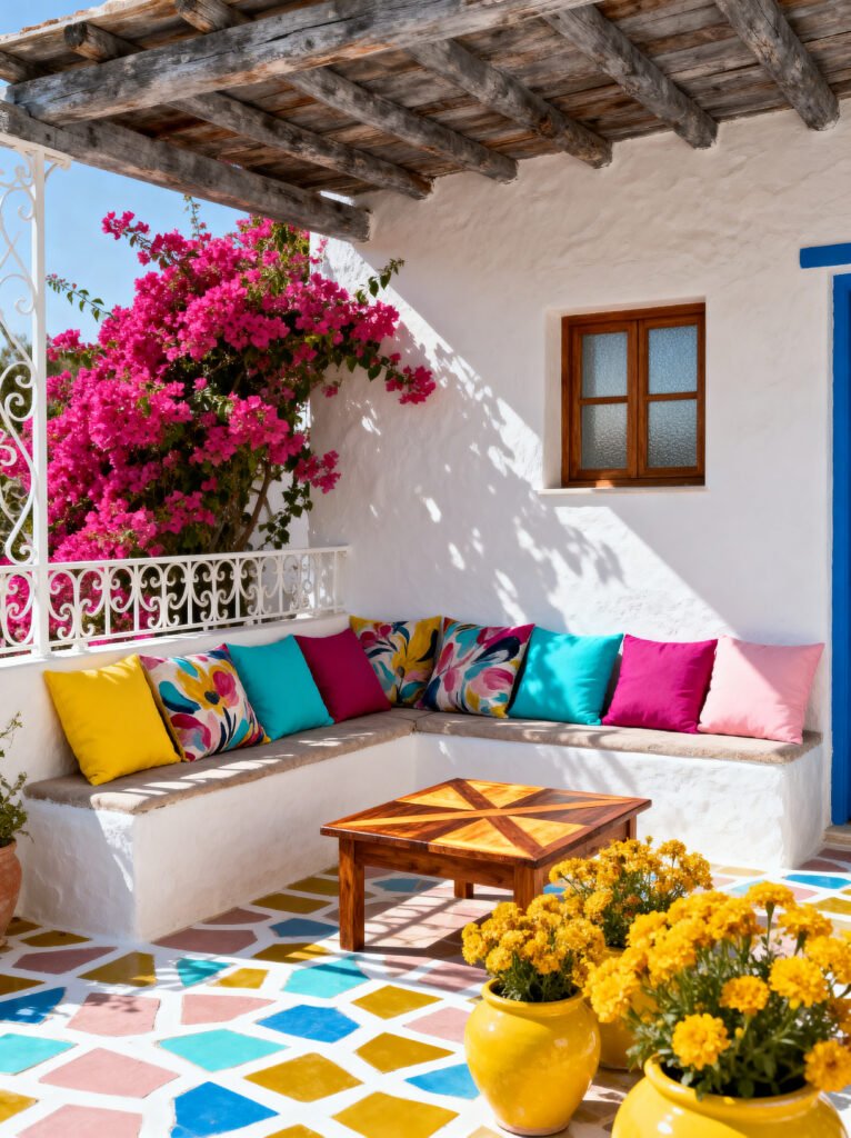 The background is a simple, textured white-washed wall, which is the perfect “canvas” for the explosion of color. The most striking element is obviously the bougainvillea. That shock of magenta pink climbing the wall is nature’s best decoration. And look how they’ve played off that color with the pillows! You’ve got hot pink, turquoise, lemon yellow, and floral prints all sitting together on the bench.