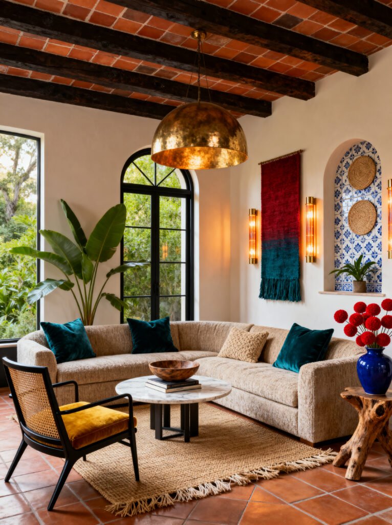 Let’s look at the ceiling first. Those dark wood beams set against the reddish-brown tiles are stunning. It makes the room feel cozy and “wrapped.” Lighting is key in a room like this, and that oversized hammered-brass dome pendant is doing a lot of work. It provides a warm, golden glow that reflects off the other brass elements in the room, like the wall sconces.