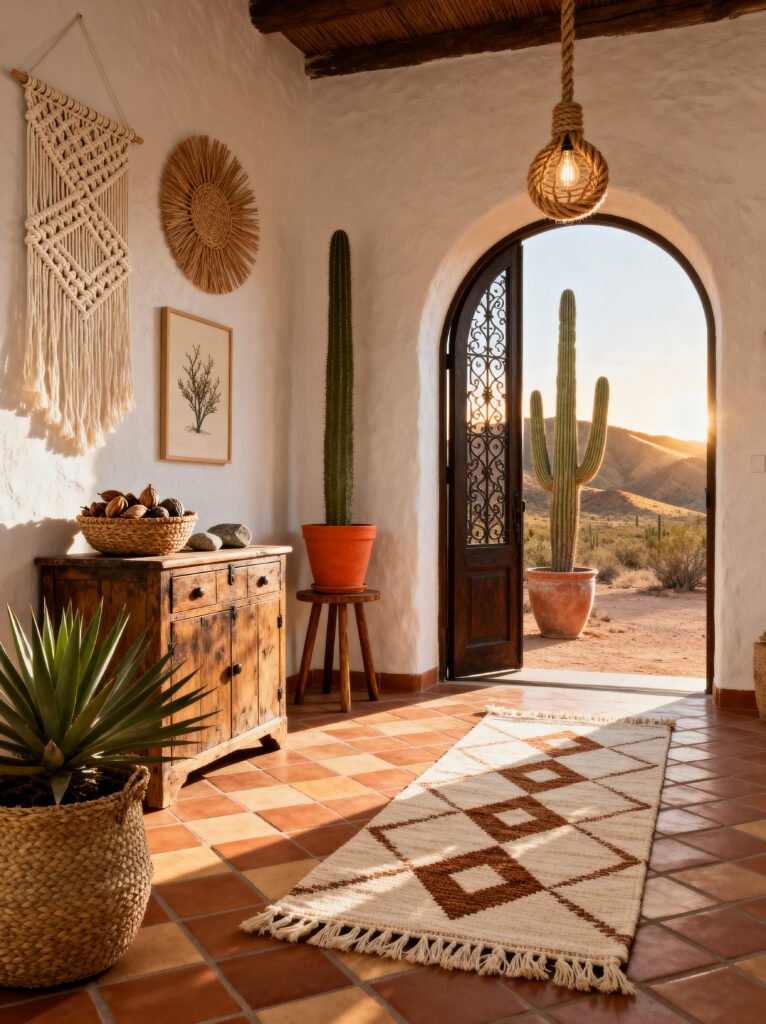 It’s an entryway that tells a story the second you walk through the door. The view through the arched doorway—a giant Saguaro cactus against a desert mountain at sunset—is breathtaking, but the interior design holds its own.