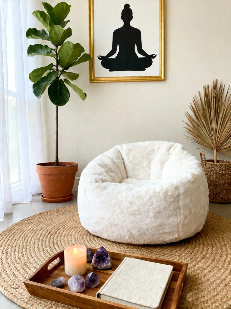 This corner is the definition of cozy-meets-mindful. The star of the show is clearly that massive, off-white faux fur bean bag. It looks so soft you could practically disappear into it for a Sunday afternoon nap or a long meditation session.