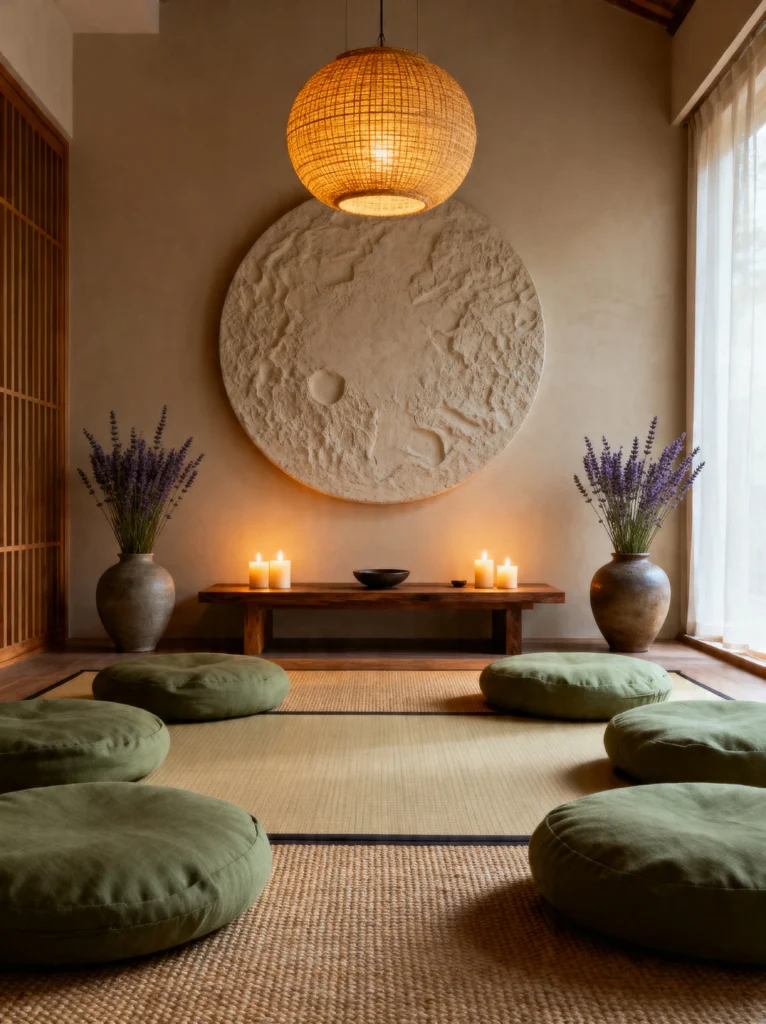 The floor is covered in tatami mats with a group of circular olive-green meditation cushions arranged in a circle. This feels like a space meant for sharing—maybe a small yoga class or a heart-to-heart with friends. With the candles glowing on the low bench and the soft light filtering through the linen curtains, it’s the ultimate sanctuary for the modern soul.