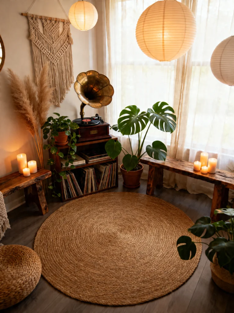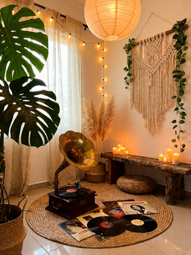 This corner feels like a warm hug from the 1970s. The focal point is that gorgeous brass gramophone—it’s a piece of history that forces you to slow down. You can’t just skip a track with a thumb-swipe here; you have to carefully place the needle, sit back on that woven jute rug, and actually listen.