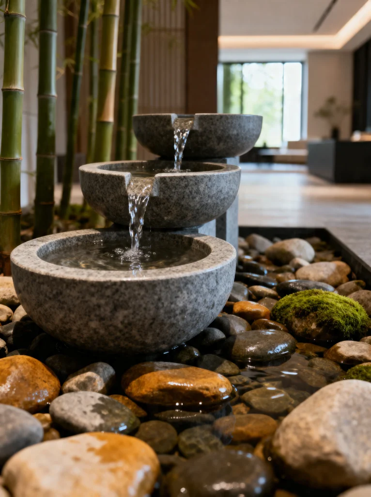 The moss-covered stones at the bottom add that touch of “wabi-sabi”—the beauty of imperfection and age. This isn’t a space meant for “doing.” It’s a space meant for “being.” The way the water creates ripples in the bottom basin is a perfect metaphor for meditation: even a small movement creates a beautiful effect. Placing something like this near a doorway or in a transition space helps wash off the stress of the day the moment you walk by.