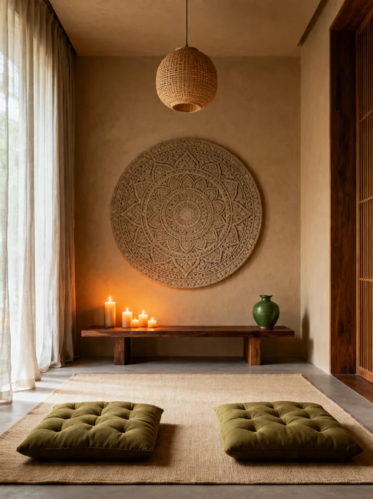This room is all about symmetry and intention. That massive, intricate mandala on the wall acts as a “drishti” or a focal point for your eyes while you sit on those olive-green floor cushions. It’s incredibly balanced. The low wooden bench with the glowing candles creates a horizontal line that feels very stable and secure.