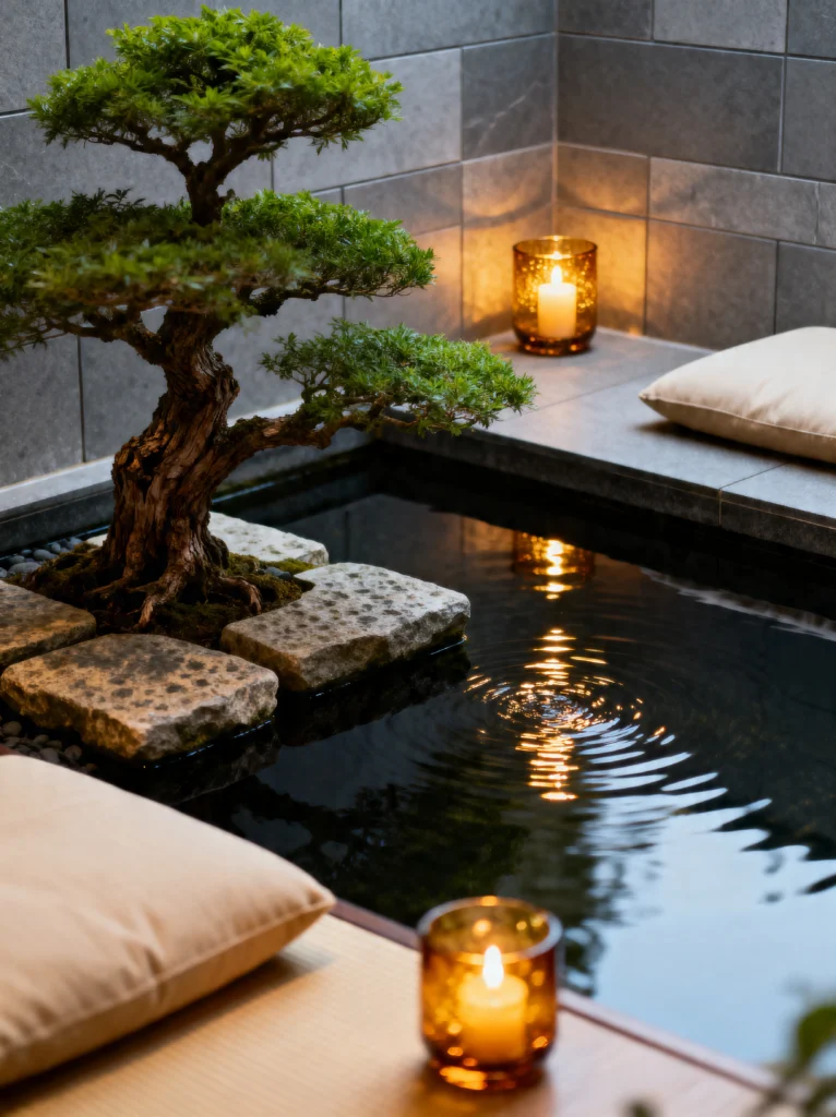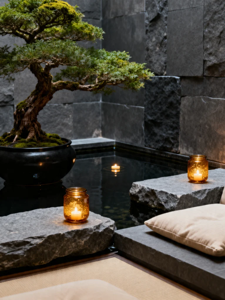 This is pure drama in the best way possible. A bonsai tree perched on stone “islands” in the middle of a dark, reflective pool? Yes, please. This space plays with the elements—wood, stone, water, and fire—in such a sophisticated way. The dark water acts like a mirror for the amber candle glow, doubling the light and the “chill.”