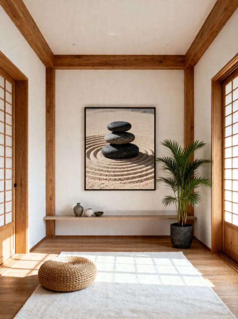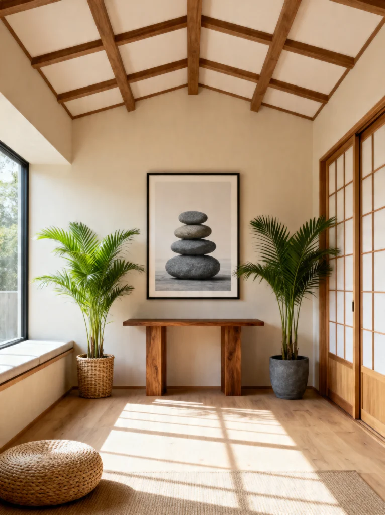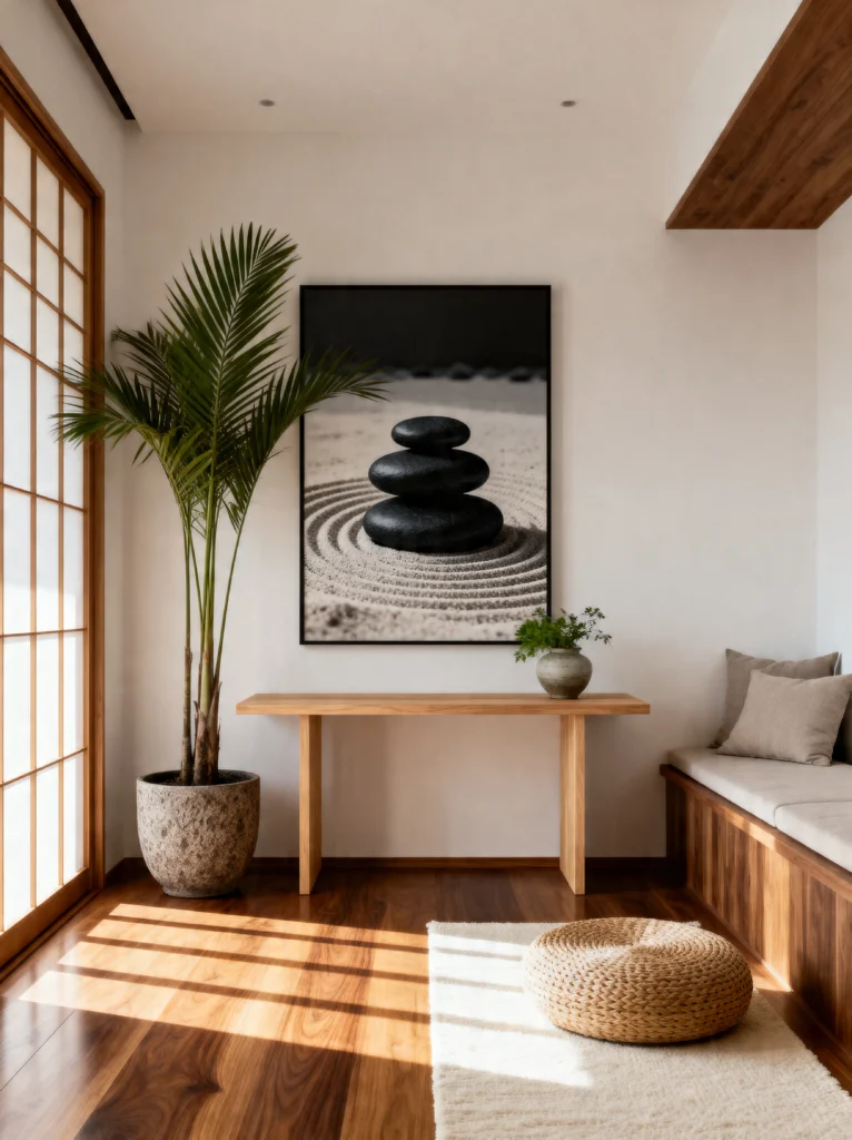 The focal point here is the artwork—a simple, striking image of stacked Zen stones. It sets the tone for the whole room: balance. I’m a huge fan of the “less is more” approach seen on the slim wooden console table, which holds nothing but a single, delicate green plant.