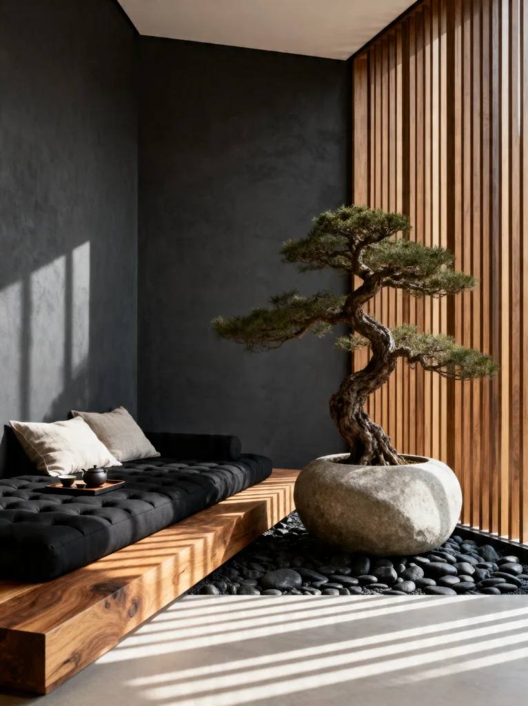 The gnarled, twisted trunk of the large bonsai in the stone pot adds an organic, raw energy to the otherwise very straight-lined architecture. This is a sophisticated take on a bedroom or a lounge. It’s proof that “Zen” doesn’t always have to be white and airy; it can be dark, rich, and grounding too.