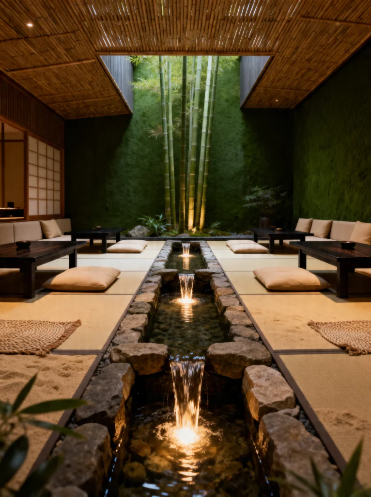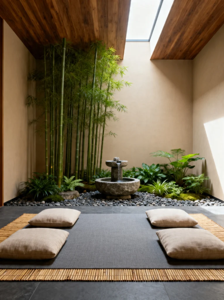 This room feels like an indoor courtyard. You’ve got the tall bamboo reaching toward the light, a central stone fountain, and four perfectly placed cushions, suggesting that peace is something to be shared with friends or family.