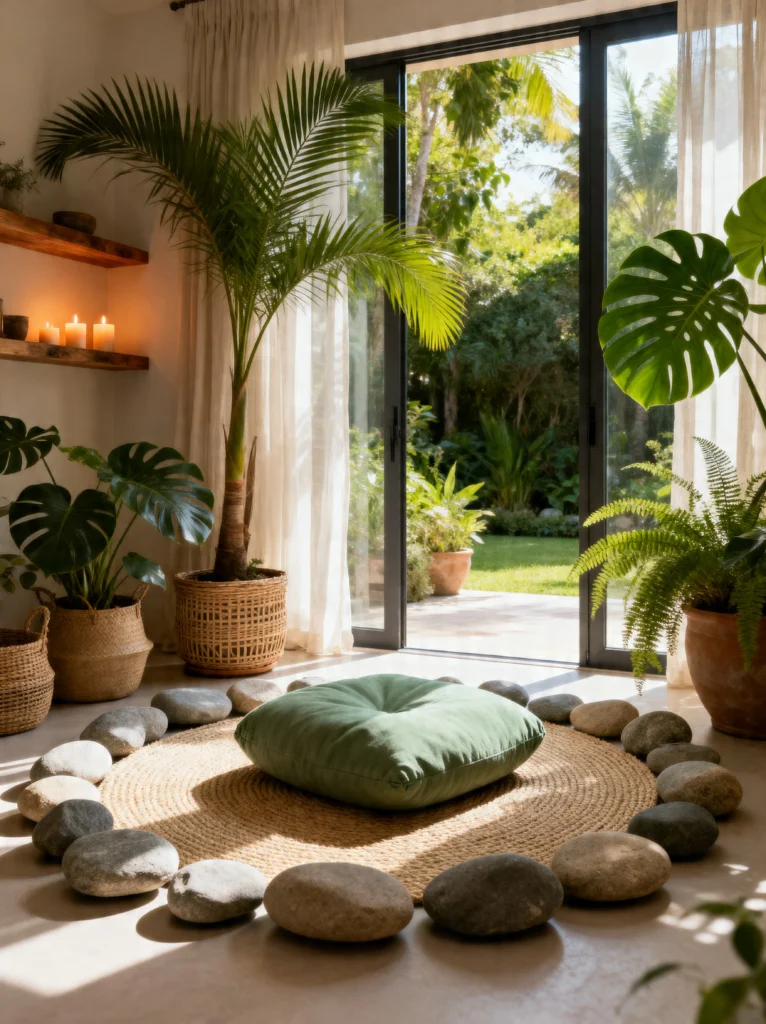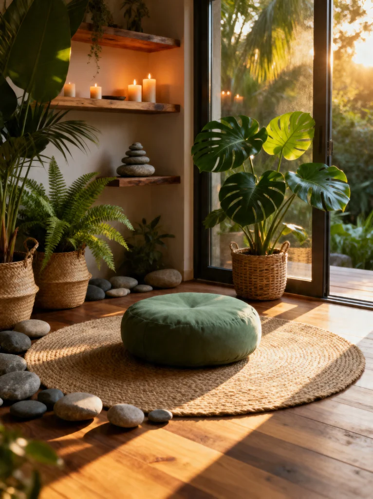 In the center of a circular jute rug sits a forest green velvet meditation cushion. The color is perfect—it pulls from the leaves of the plants and feels incredibly grounding. Imagine sitting here as the sun sets, the candles flickering against the wall, and the shadows of the Monstera leaves dancing on the floor. It’s pure magic.
