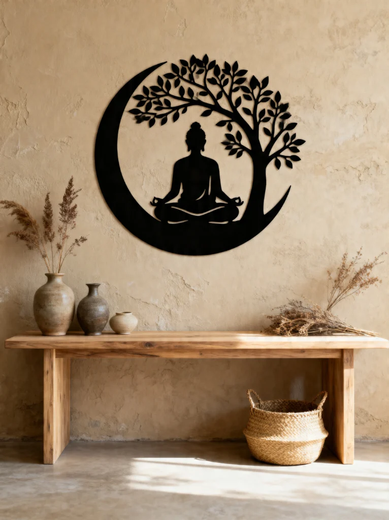 This space is the definition of “less is more.” The centerpiece is that incredible metal wall art of a Buddha seated within a crescent moon that transforms into a tree. It’s such a clever way to blend the celestial with the earthly.