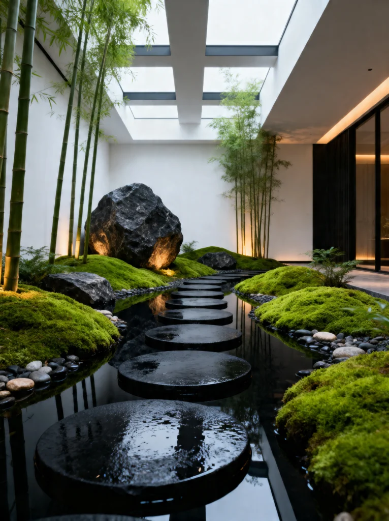 The real star here is the water feature. Those black, circular stepping stones look like they’re floating on a mirror. There’s something so intentional about having to watch your step; it forces you to practice mindfulness without even trying. You can’t rush through a space like this.
