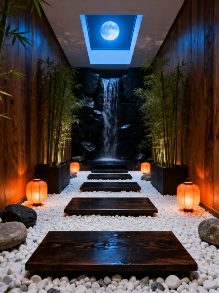 I love the use of white river stones. They aren’t just for looks; they create a crunching sound when you walk, adding another sensory layer to the experience. This design proves that Zen doesn’t always have to be white and bright. It can be dark, dramatic, and cozy. If you have a narrow corridor or a transition space in your house, adding some tall planters with bamboo and low-level lighting can completely change the energy. It’s no longer just a way to get from Room A to Room B—it’s a journey.