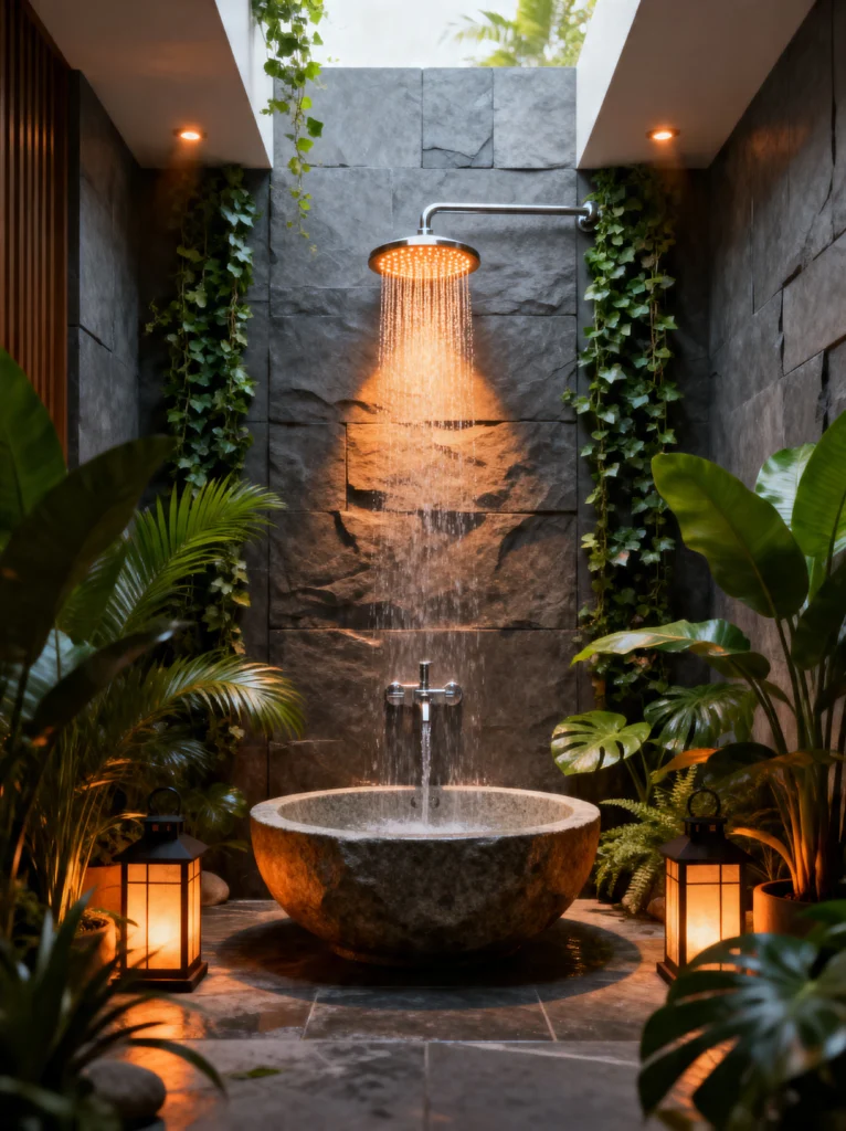 The way the water falls from the oversized rain shower head directly into the basin creates this beautiful, hypnotic sound—like standing under a gentle waterfall in the tropics. And the greenery! Having ivy and ferns climbing the stone walls makes the space feel alive. It’s basically “Forest Bathing” but with the luxury of hot water and privacy.